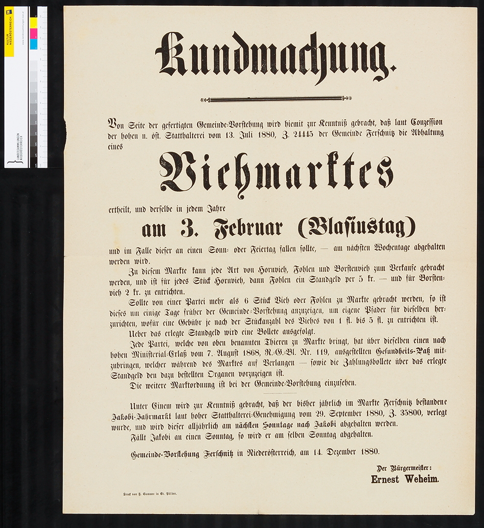 Kundmachung, Viehmarkt Ferschnitz, Bürgermeister Ernest Weheim, 3. Februar 1880.