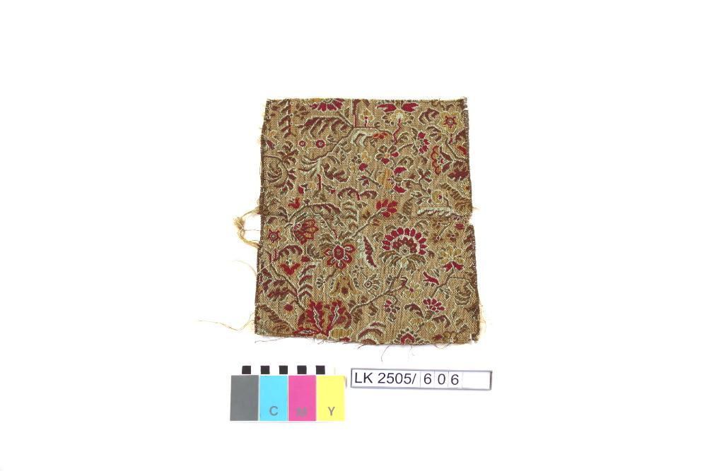 Stoffmuster in beige, mit Blumen- und Blattmuster in rot, ocker, hellblau, grün; Muster für Dekorstoff; figural ornamentiert;