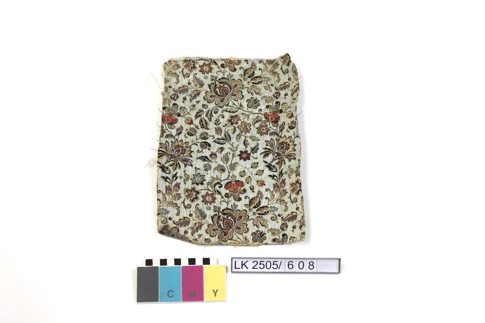 Stoffmuster in türkis, mit Blumen- und Blattmuster in schwarz, rosa, gelb, rot, ocker, braun; Muster für Dekorstoff; figural ornamentiert;