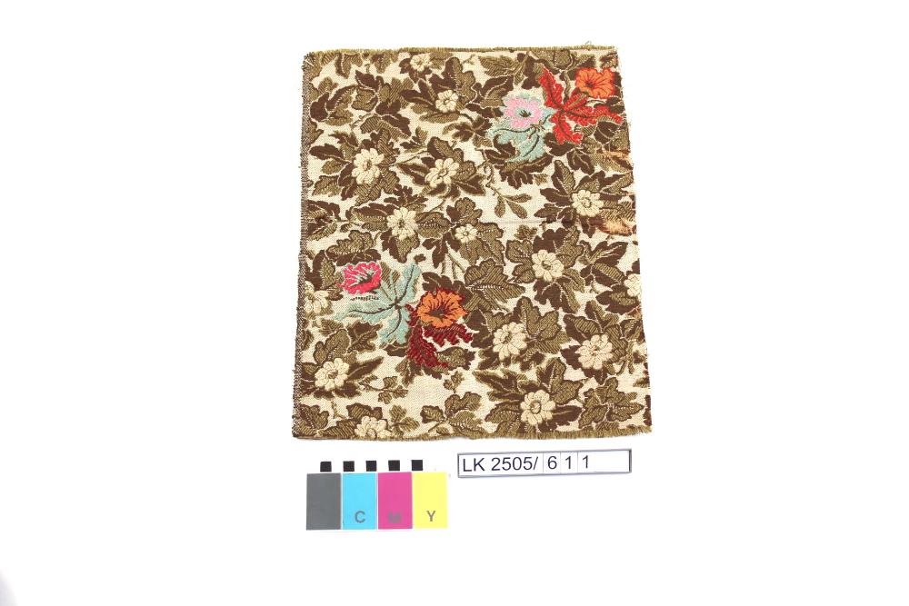 Stoffmuster in weiss, mit Blumen- und Blattmuster in grün, rot, gelb, blau, rosa, weiss, orange; Muster für Dekorstoff; figural ornamentiert;