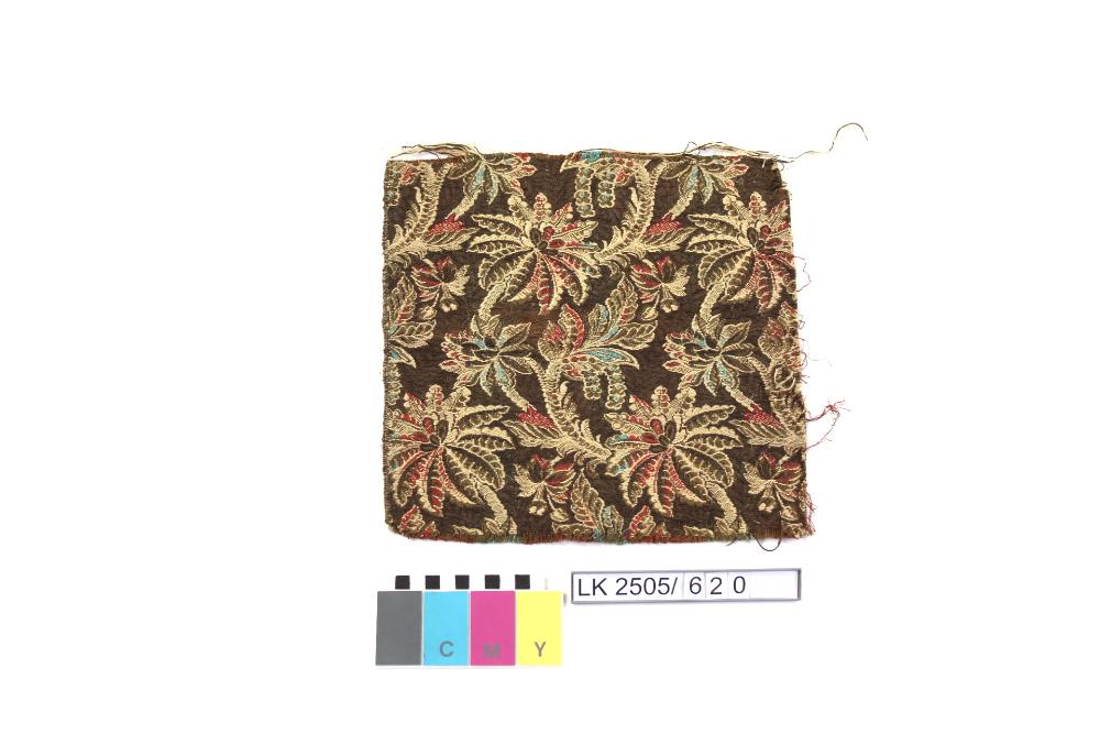 Stoffmuster in braun, mit Palmenmuster in natur, grün, rot, blau; Muster für Dekorstoff; figural ornamentiert;