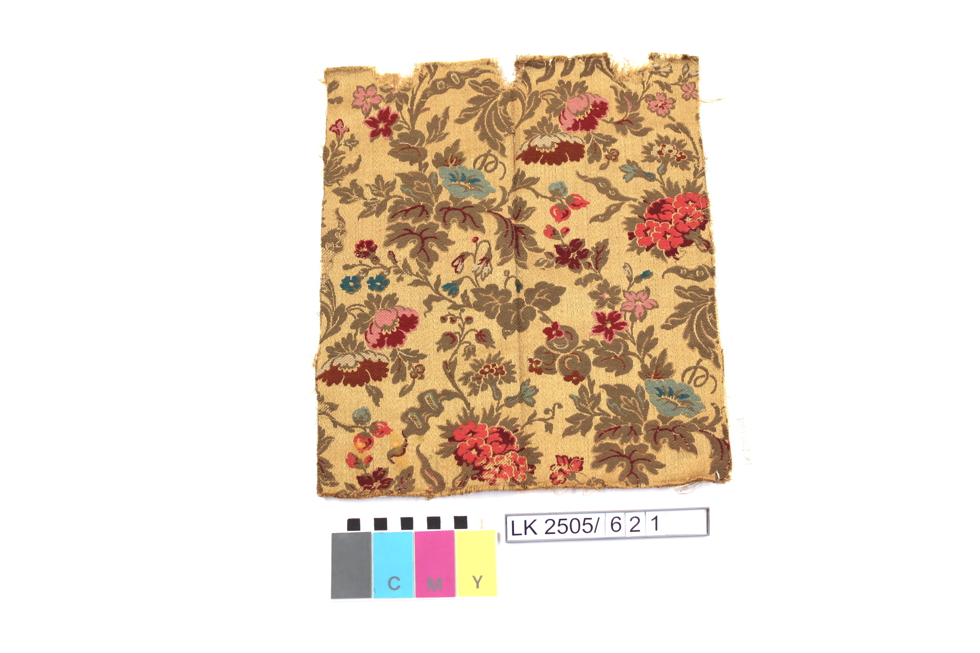 Stoffmuster in gelb, mit Blumen- und Blattmuster in braun, rot, rosa, blau; Muster für Dekorstoff; figural ornamentiert;