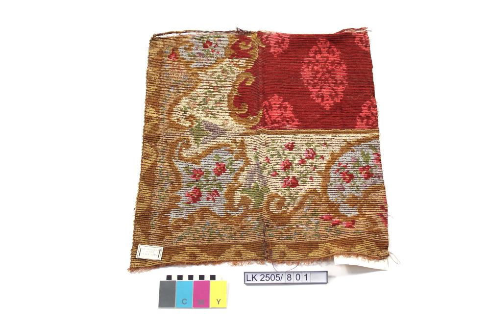 Stoffmuster aus Chenille in rot, mit Bordüre in braun, weiss, blau, rot, rosa, lila, grün; Dekorstoffmuster aus Chenillegewebe