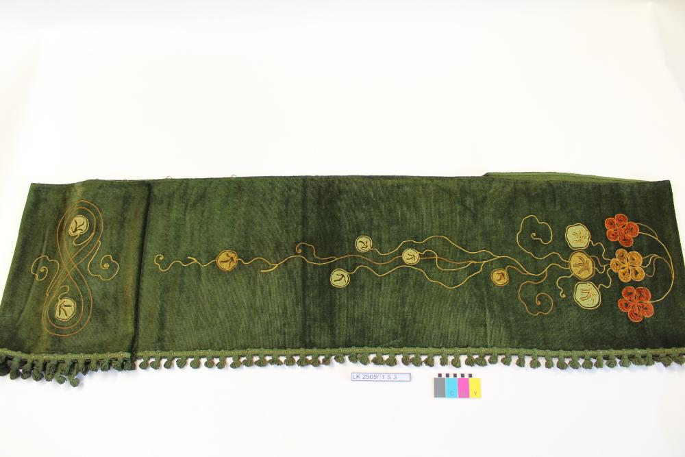 Seitenteil in grün mit Schnurstickerei in Grün-, Brauntönen, floraler Jugendstil, Quastenborte. 4 Montageringe; Vorhangseitenteil; mit Chenillefaden bestickt; Borte mit Quasten (z. T. leonischer Faden); Ringe zum Aufhängen; floraler Jugendstil; Teil ei