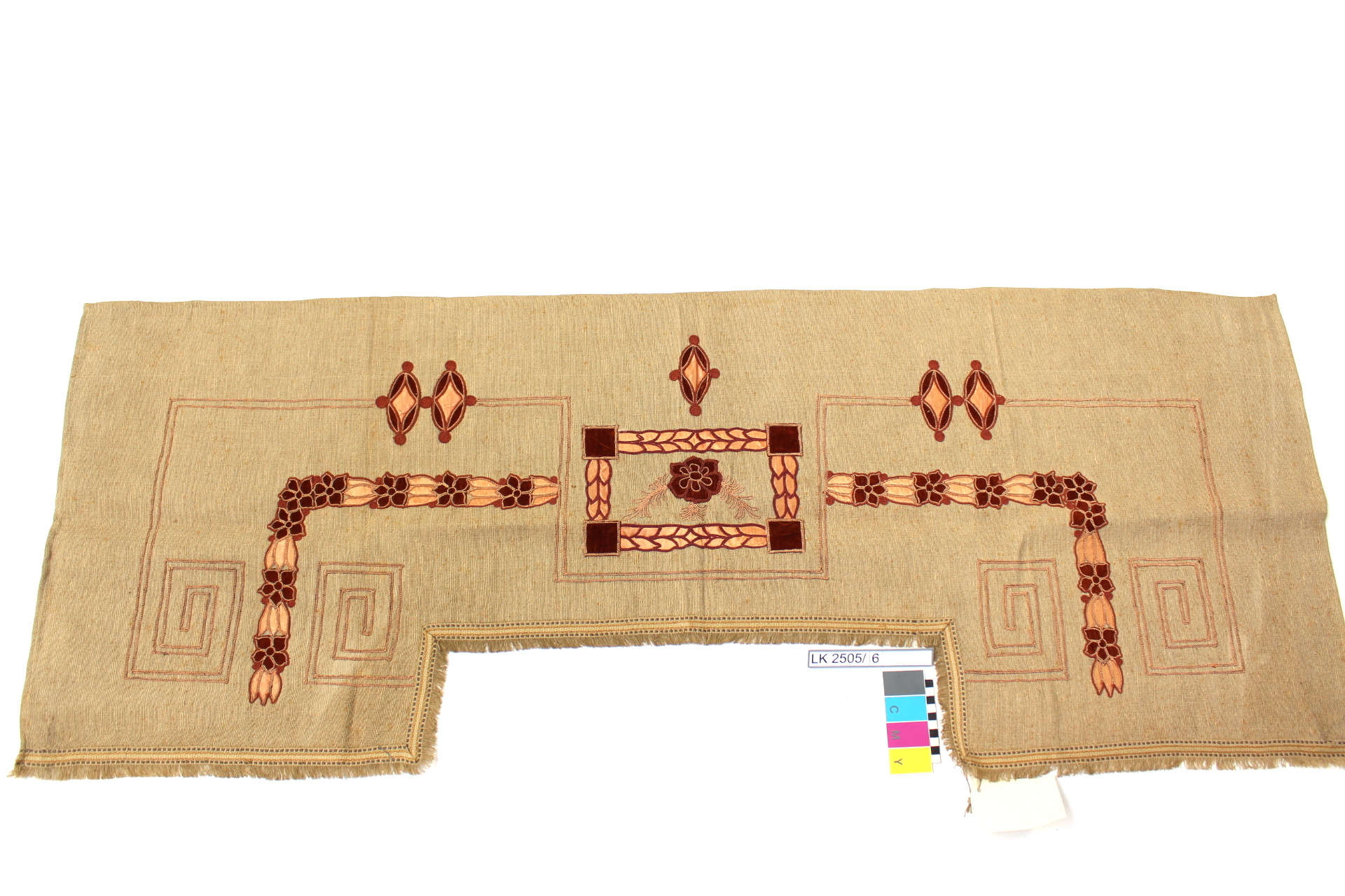 Altrosa und braun, Leinenportiere mit geometrischer und floraler Applikationsstickerei; Portiere eines Vorhanges; mit leonischer Stickerei