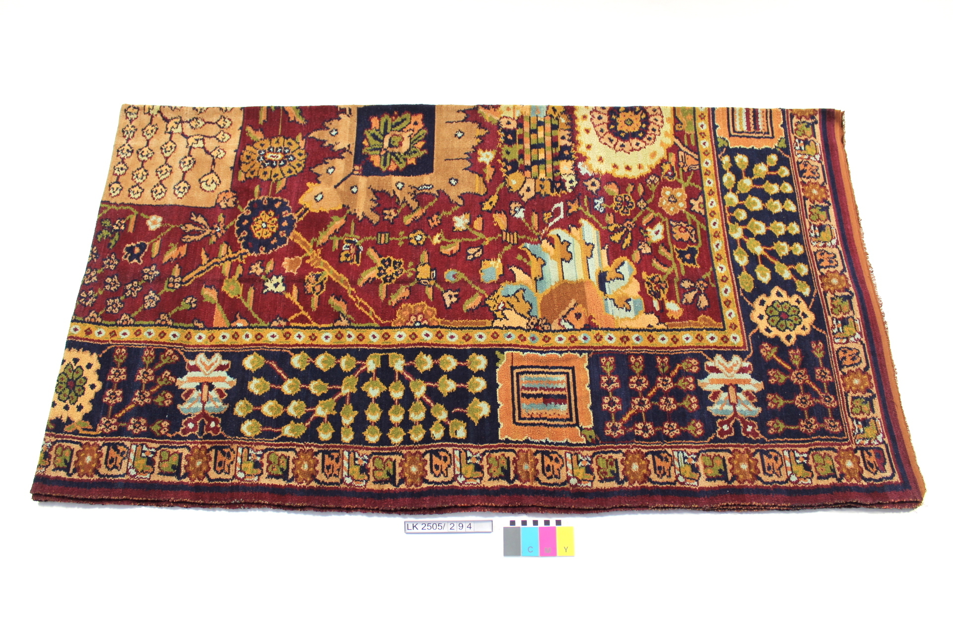 Teppich in rot aus Chenille, mit Bordüre in blau, mit geometrisch floraler Musterung (teilweise asymetrisch) in beige, grün, blau, rot, gelb; Teppich aus Chenillerohware; figural Ornamentiert;