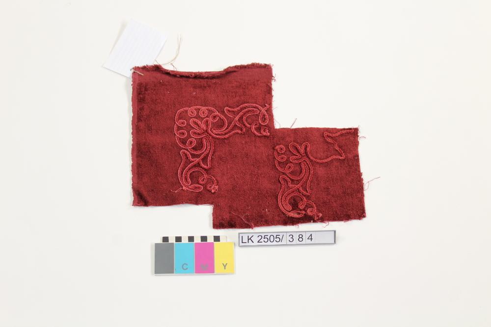 Stickprobe auf rotem Samt, rote Schnurstickerei; Stickprobe für Stick- und Perlmaschinen; Chenillefaden