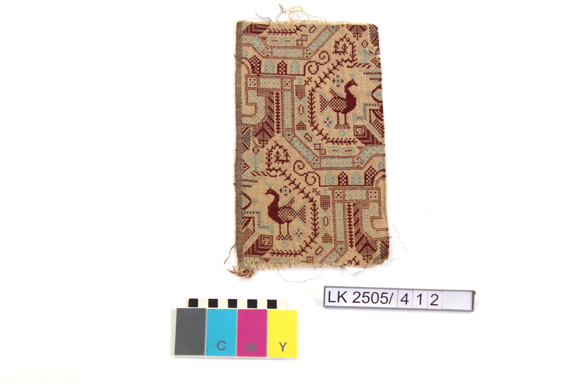 Stoffmuster in beigeund gold mit geometrischem Muster und Pfauen in rot, blau; Dekorstoffmuster; figural ornamentiert;