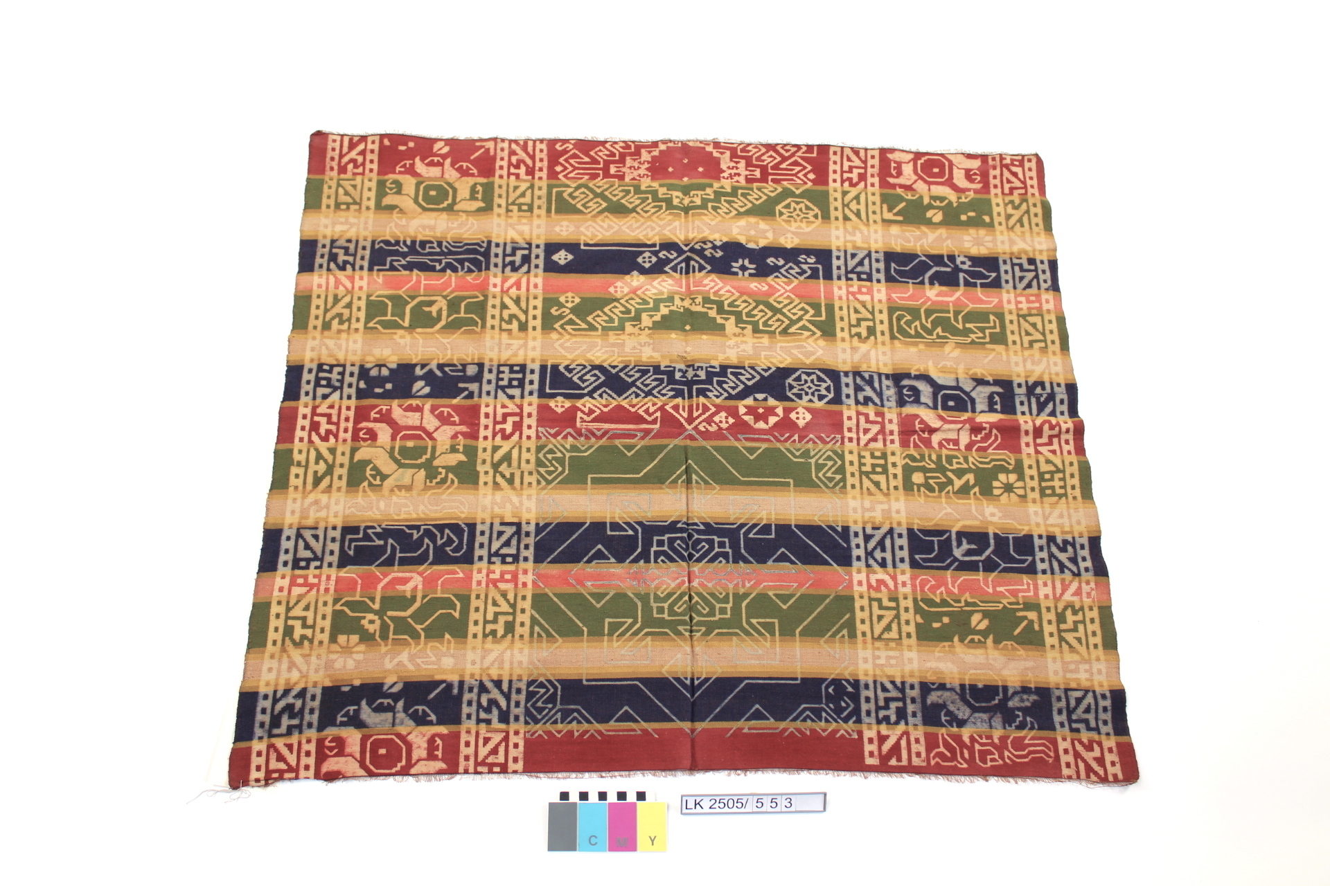 Stoffmuster quergestreift in rot, blau, grün, gelb, beige, mit gebleichten geometrischen Mustern; Druckmuster (mehrfärbig) für Dekorstoff