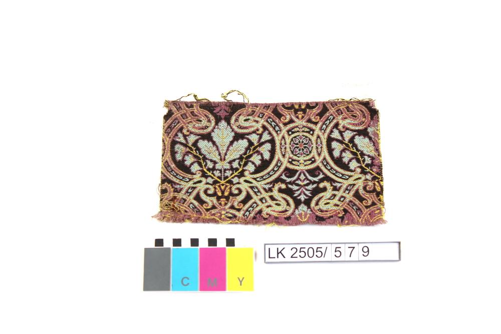 Stoffmuster in schwarz, mit geometrischem Blattmuster in türkis, lila, gelb; Muster für Dekorstoff; figural ornamentiert;