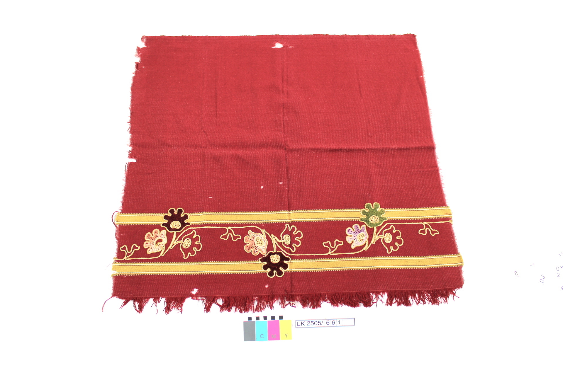 Stoffmuster in rot, mit Querstreifen und Schnurstickerei in grün, lila, dunkelrot, rosa, gold, mit Fransenabschluss; Stickproben mit Chenillefaden und teilweise leonischem Faden für Stick- und Perlmaschinen