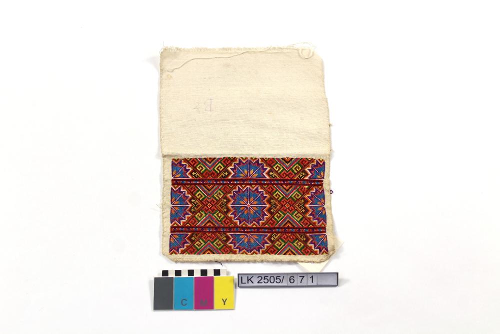 Stickereibesatz in weiss, mit geomtrischer Stickerei in blau, orange, lila, grün, rot, weiss, schwarz; Stickprobe auf Leinengrund