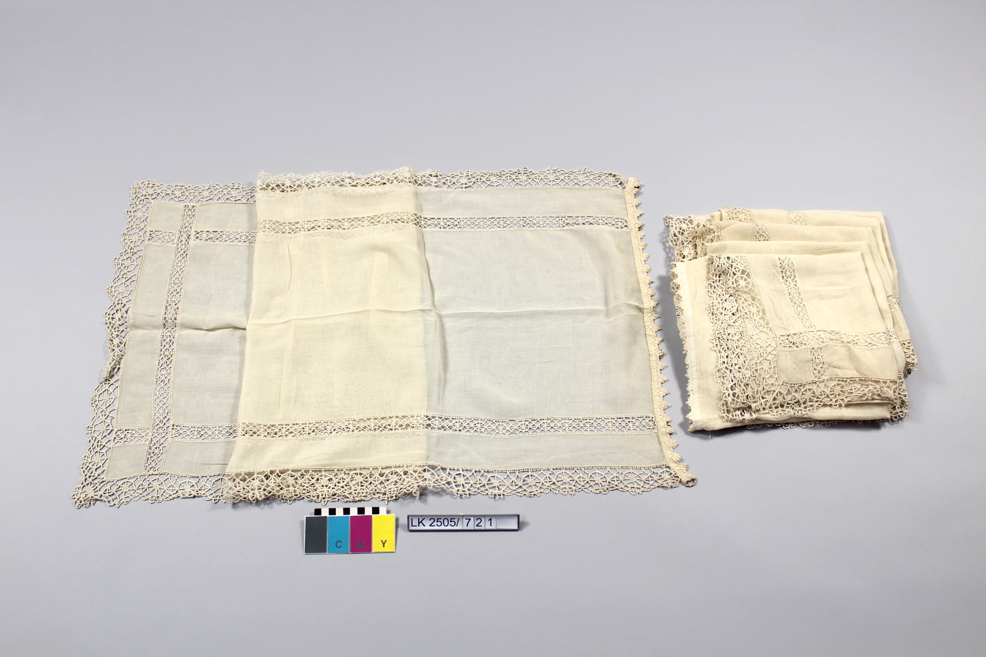6 Stück Gardinen in natur, mit Klöppelspitzen und Borte. Montageringe goldfarben; Konvolut bestehend aus sieben Stück Gardinen bzw. Gardinenspitze