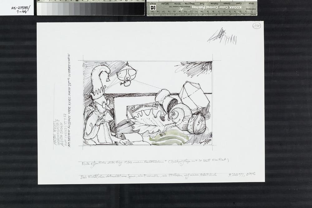 SignaturRecto, monogr. unten rechts: "AW"; Recto, bez. unten links: "Das Wichtlchen betrachtet eine Szene, ein Ensemble, ein Stilleben auf seinem Arbeitstisch", dat. unten rechts: "9. Juli 77, 0.37 h"; Recto, oben rechts: "138" [in einem Kreis eingeschrieben]; Re