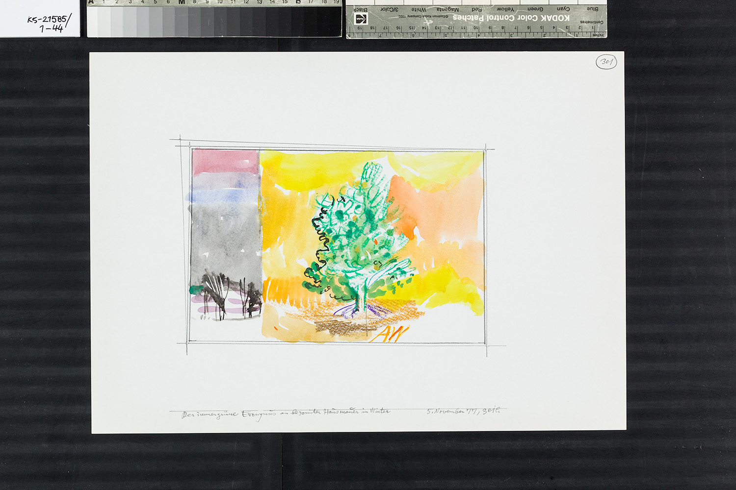 SignaturRecto, monogr. unten rechts: "AW"; Recto, bez. unten links: "Der immergrüne Euonymus an besonnter Hausmauer", dat. unten rechts: "5. November 77, 3.01 h"; Recto, oben rechts: "301" [in einem Kreis eingeschrieben]