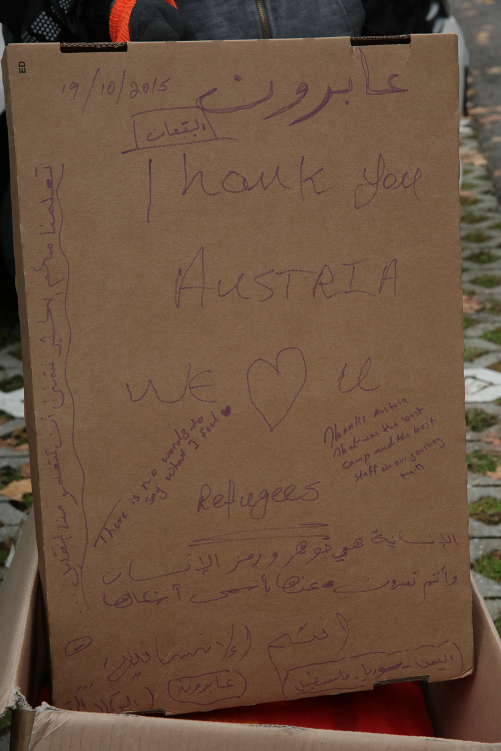 Schachtel, am Unterboden beschriftet mit mehreren Englisch-Arabischen Botschaften von Menschen, die bis zur Auflösung der Unterkunft am 20.10.2015 im Wirtschaftshof St. Pölten untergebracht waren.