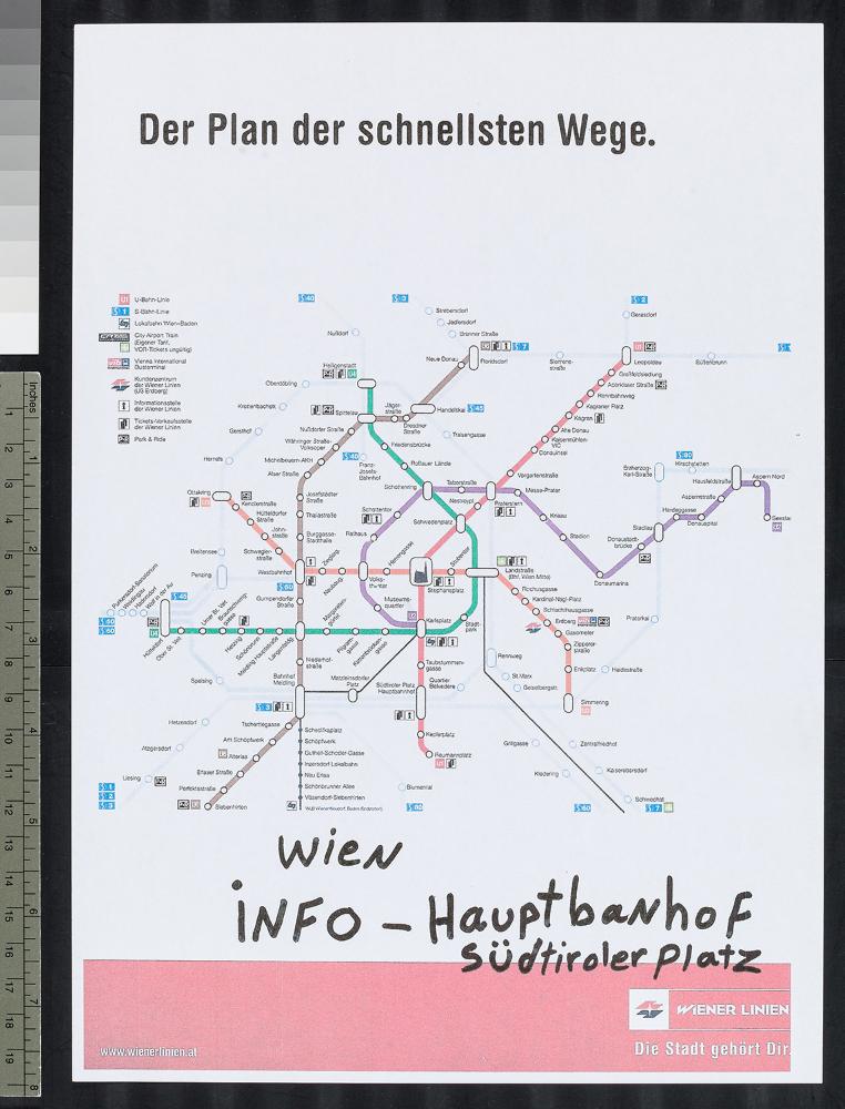Infozettel U-Bahnplan Wien mit handschriftlicher Ergänzung „Wien – Info – Hauptbahnhof. Südtiroler Platz“
