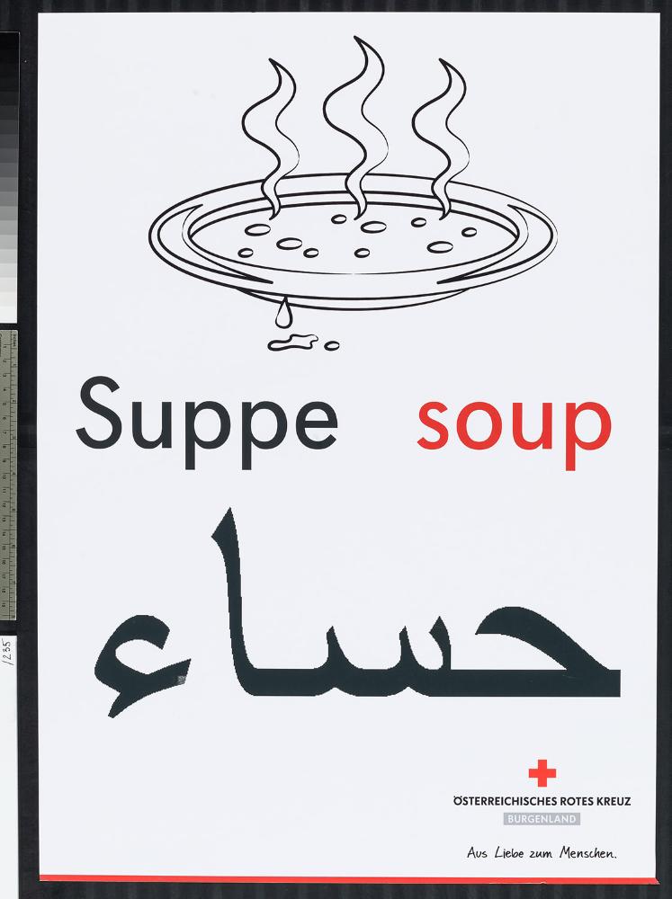 Plakat Rotes Kreuz Burgenland, Nickelsdorf: Suppenteller, draunter „Suppe, Soup“ und in Arabsich/Farsi; rechts unten: Logo RK Burgenland „Aus Liebe zum Menschen“