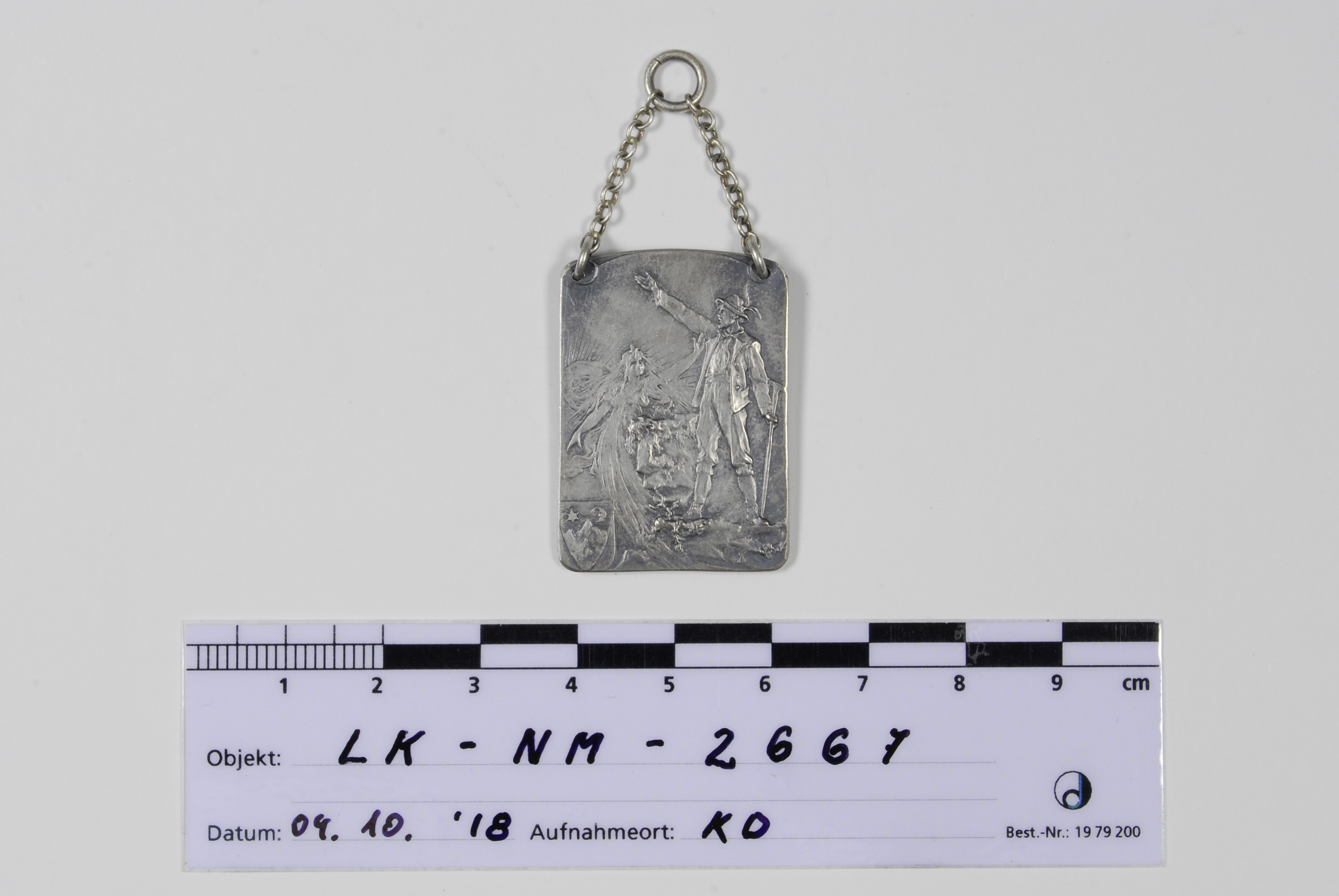 avers: Bergwanderer mit erhobener Rechter, daneben weibliche Gestalt in Gloriole, die Linke erhoben; Wappen des Alpenvereins