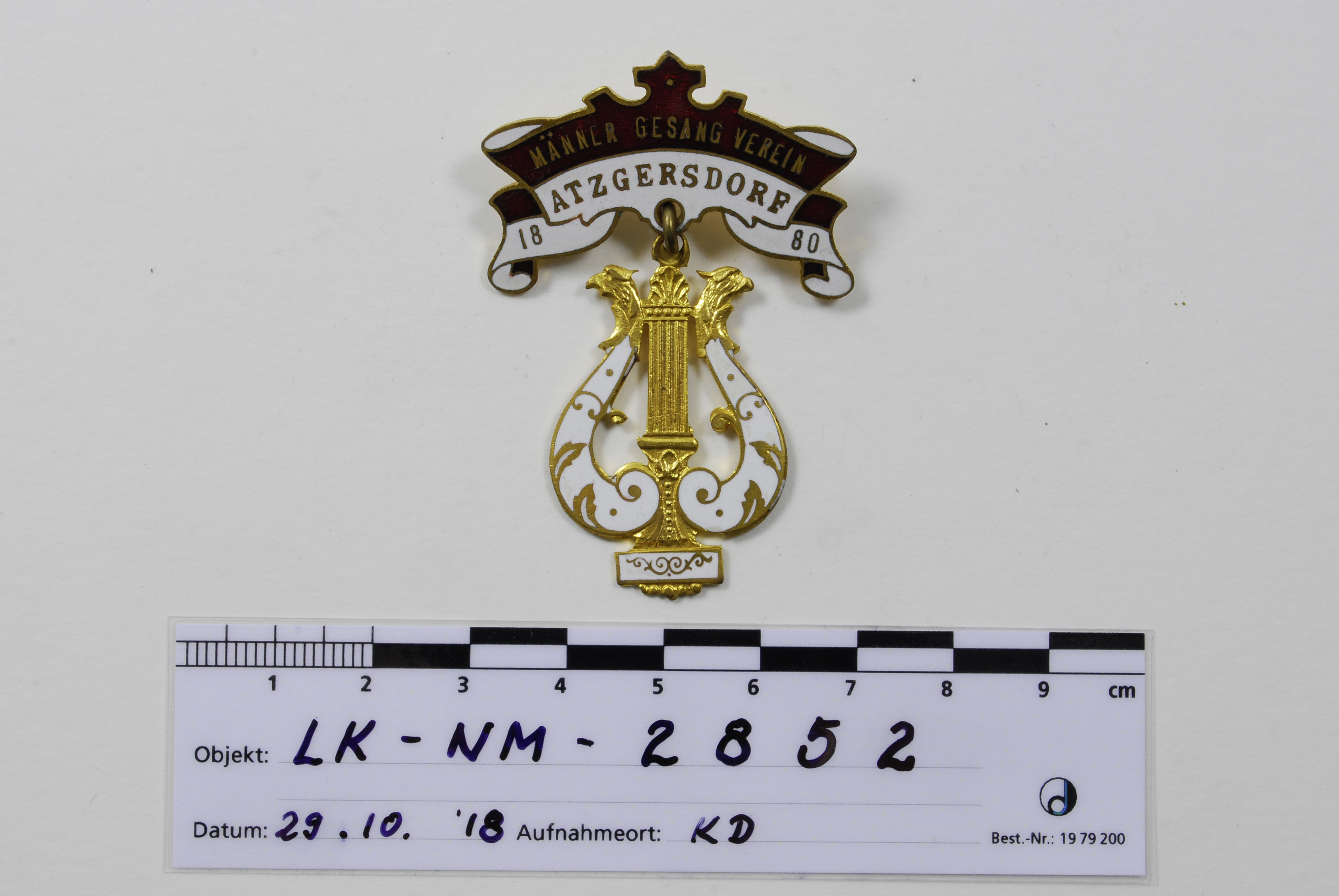 Technische DetailsMessing, geprägt, montiert, vergoldet, transluzid rot und opak weiß emailliert, Nadel montiert