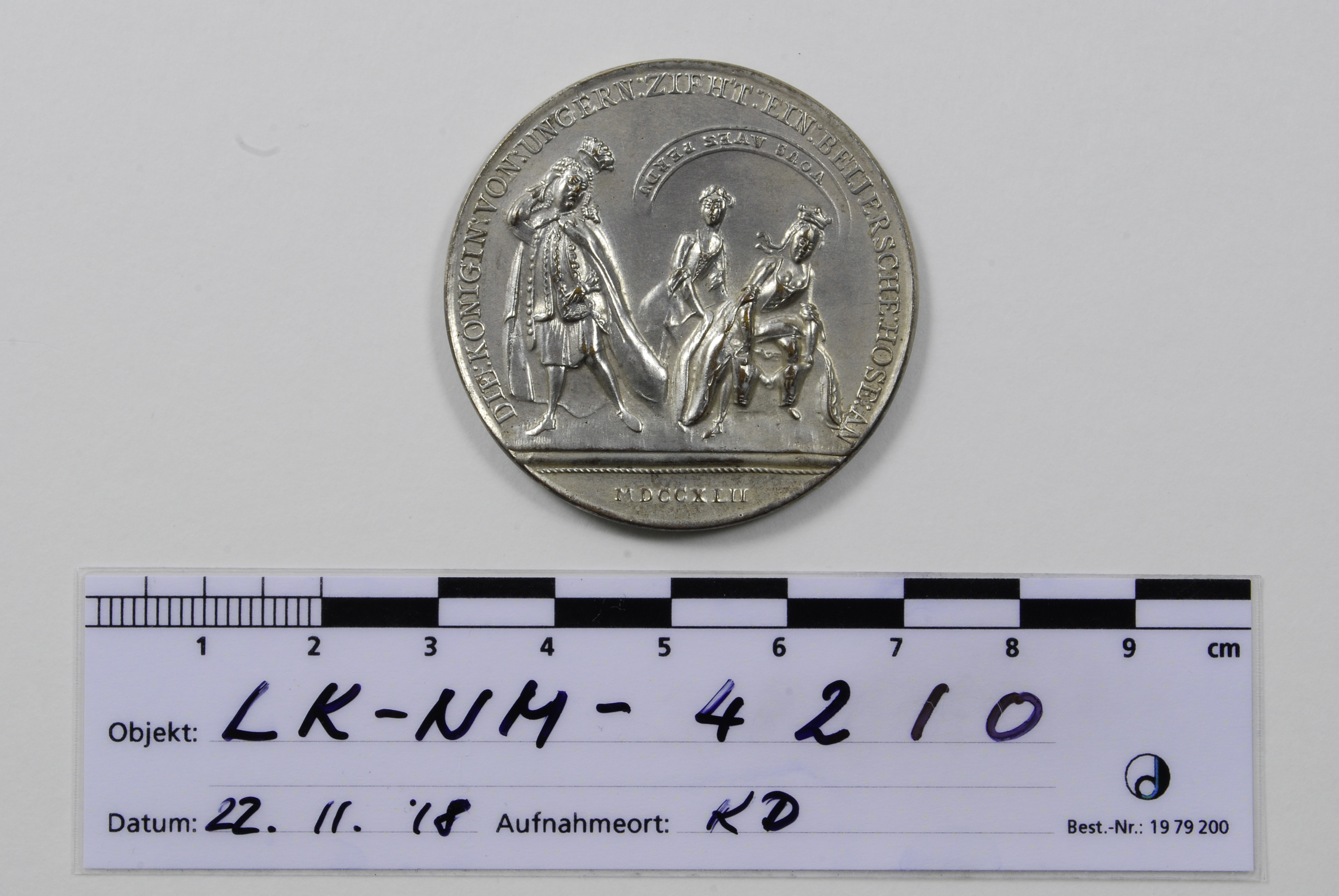 revers: rechts Maria Theresia, eine Herrenhose unter ihr eigenes Kleid ziehend; hinter ihr eine Hofdame, welche ihr beim Ankleiden behilflich ist; links Karl VII, welcher die ihm vom Kopf gleitende Krone zu greifen versucht
