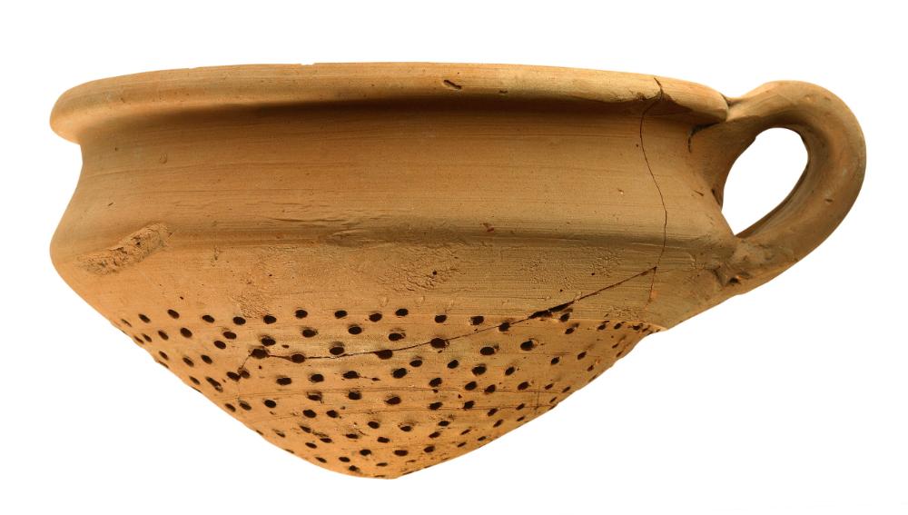 Vollständig erhaltenes, geklebtes Sieb. Spitz zulaufender, mit Löchern durchsetzter Boden. Bandförmiger Ringhenkel. Oxidierend gebrannte Keramik.