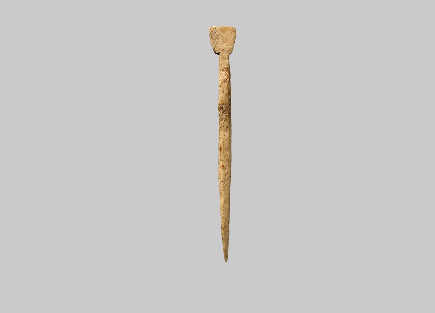 Ganzform eines Stilus mit breiter, trapezförmiger Glättfläche und im Querschnitt langovalem, glattem Stiel.