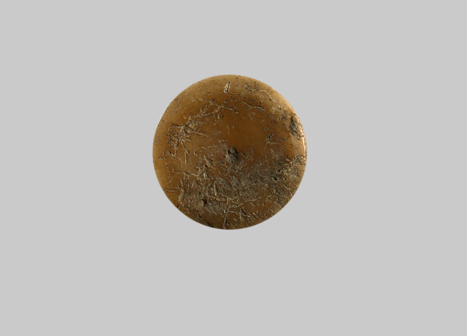 Flacher Spielstein. Oberseite mit zentralem Punkt und muldenförmiger Vertiefung. Glatte Unterseite. Leicht schräge Wand.