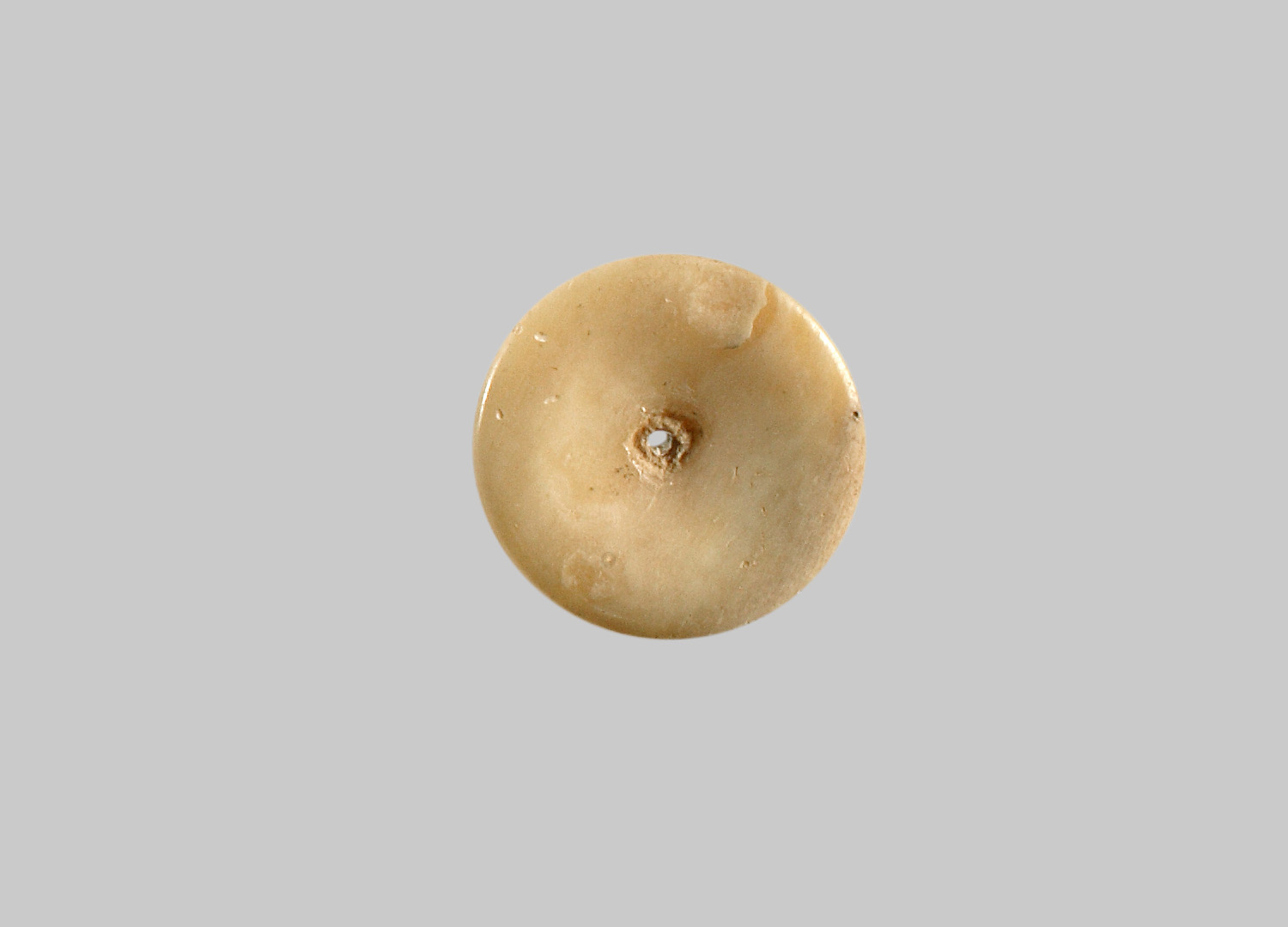 Flacher Spielstein. Oberseite mit zentralem Loch und muldenförmiger Vertiefung. Glatte Unterseite, im Randbereich an zwei Seiten abgeschrägt. Schräge Wand.