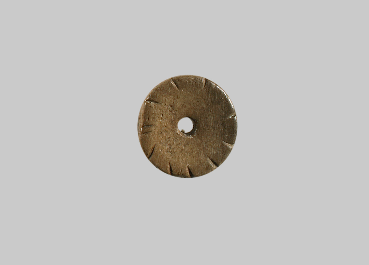 Flacher Spielstein. Oberseite mit zentralem Loch und leicht muldenförmiger Vertiefung. Kerbdekor entlang des Randes. Glatte Unterseite. Leicht schräger Rand.