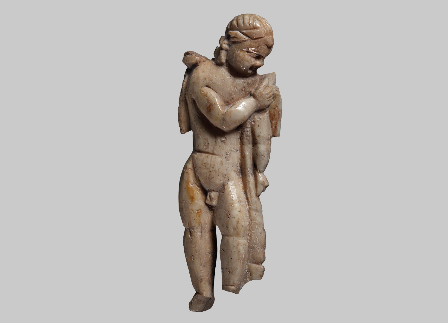 Geflügelter, nackter Amor, der sich nach links wendet und sich auf eine lange Fackel stützt. Federn und Frisur sind durch schräge, parallele Linien angedeutet. Beide Füße sowie ein Teil der Fackel sind abgebrochen. Auf der linken Körperseite befindet sich ein länglicher Schlitz, der auf die Verwendung des Objekts als Griff eines Klappmessers hindeuten könnte.