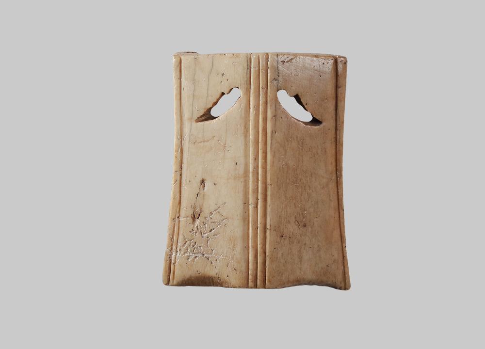 Rechteckiges Kastenortband mit leicht geschwungenen Längsseiten und eingezogener unterer Schmalseite. Zwei Durchbrechungen. Doppelte Mittelrippe. Randbegleitende Längsrillen. Diente als unterer Abschluss der Schwertscheide.