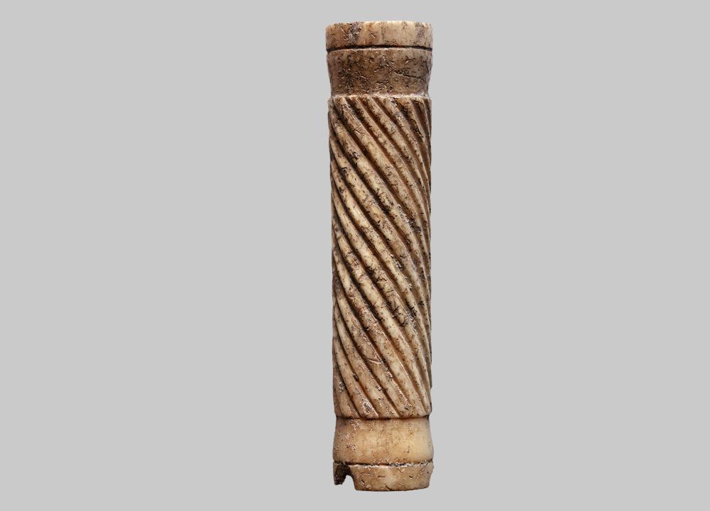 Länglicher, im Querschnitt runder Griff, von dem ca. 1/4 abgebrochen ist. An den beiden glatten Enden befindet sich jeweils eine umlaufende Rille. An einem Ende ist eine halbkreisförmige, zum Teil ausgebrochene Öffnung zur Aufnahme des metallenen Niets. Der erhabene Mittelteil ist flächig diagonal gerillt.