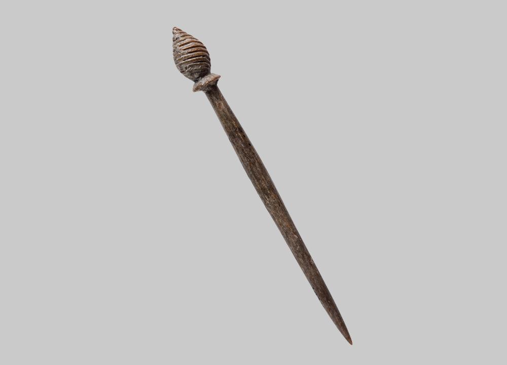 Kopf in Form eines Pinienzapfens auf einfachem Sockel. Schräge Kerbung am Zapfen. Glatter, vollständig erhaltener Schaft.