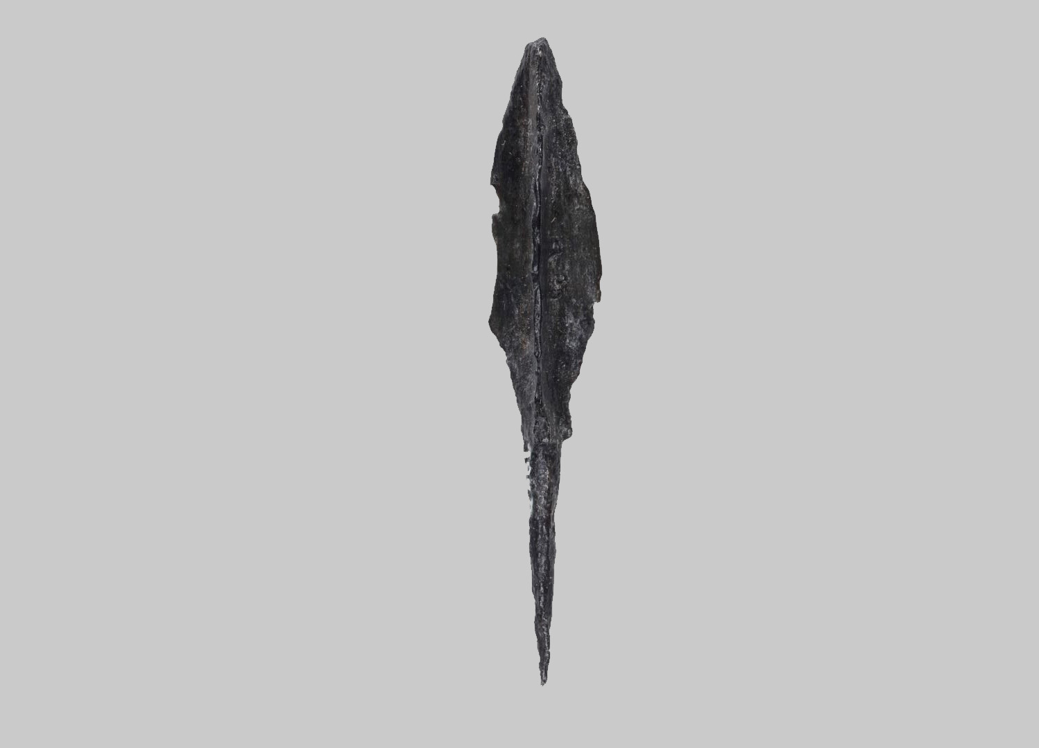 Dreiflügelige Pfeilspitze mit im Querschnitt kreisförmigem Dorn. Die Spitze und Flügelenden sind abgebrochen.