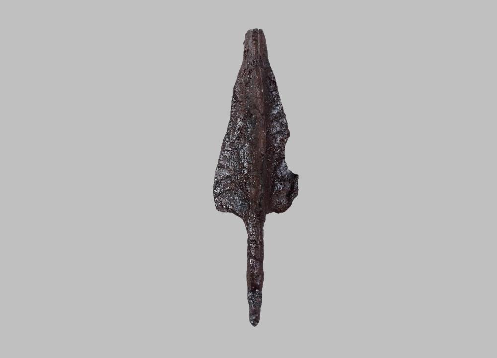 Dreiflügelige Pfeilspitze mit im Querschnitt kreisförmigem Dorn. Die Spitze ist abgebrochen. Die Flügelenden sind fragmentiert erhalten.