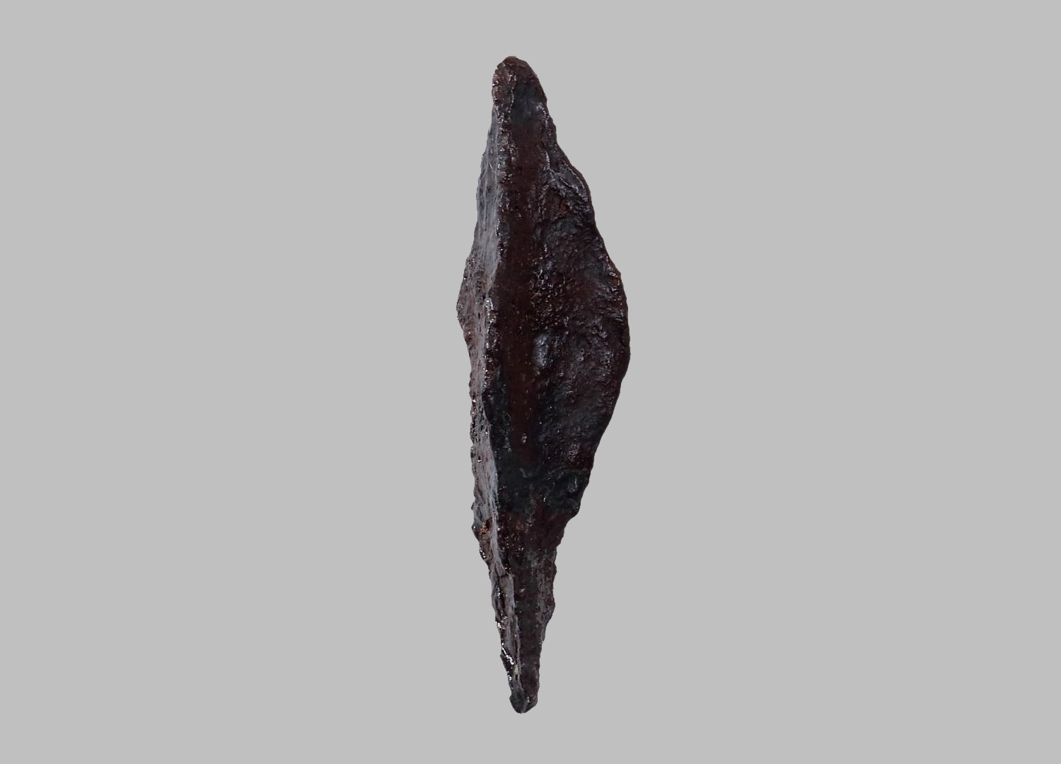 Dreiflügelige Pfeilspitze mit abgebrochenem Dorn. Die gerundeten Flügelenden sind fragmentiert erhalten.