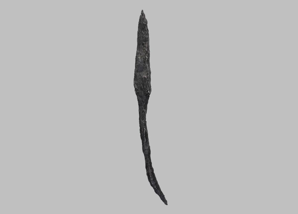 Vierkantige Pilumspitze mit fragmentierter, pyramidenförmiger Spitze und vom Kopf abgesetztem, fragmentiertem, im Querschnitt kreisförmigem Dorn.