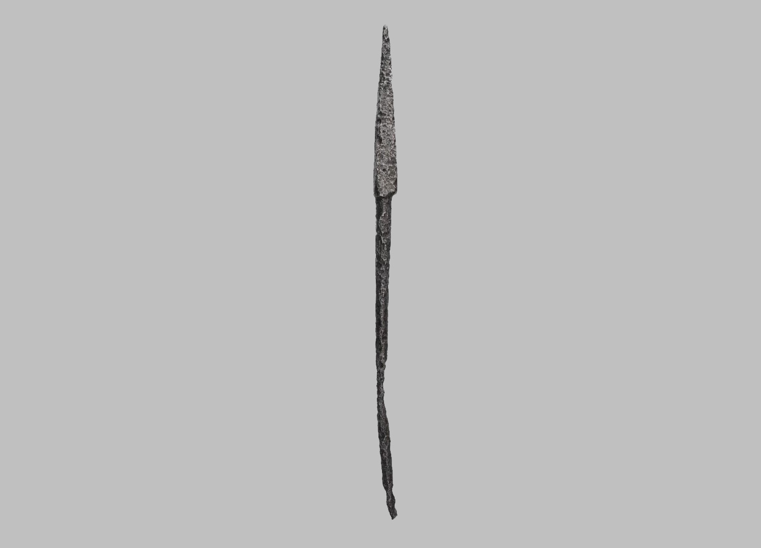 Vierkantige Pilumspitze mit schlanker, pyramidenförmiger Spitze und vom Kopf abgesetztem, fragmentiertem, im Querschnitt kreisförmigem Dorn.