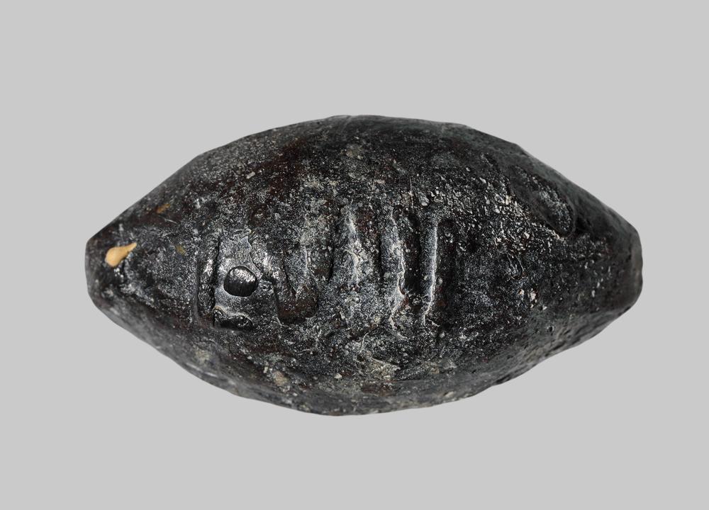 Mandelförmiges Schleudergeschoss mit dem Stempel L VIII der Legio VIII Augusta.