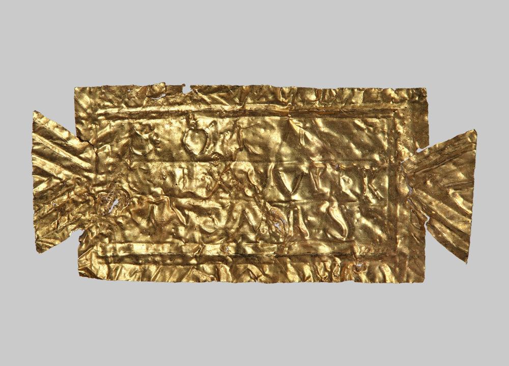 Das kleine Votivtäfelchen aus Gold mit gefiederten "Henkeln" (tabula ansata) ist bis auf geringe Beschädigungen vollständig erhalten. Der Text steht zwischen deutlich vorgerissenen Zeilenlinien. Die Schrift ist auf dem dünnen, verknitterten und teilweise wieder glatt gepressten Blech schwer lesbar. Weihung des Gargilius Exsuperatus für den Sonnengott (Mithras ?).