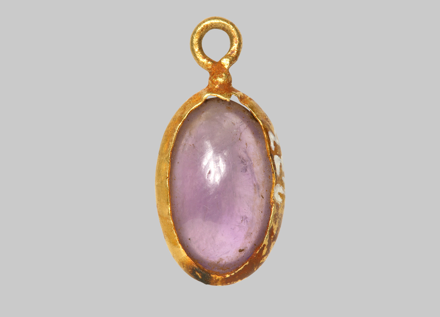 Ovaler gewölbter Amethyst, eingefasst von einem schmalen Goldblechstreifen. Fassung und Öse aus dünnem Draht sind durch Granulatkügelchen verbunden.