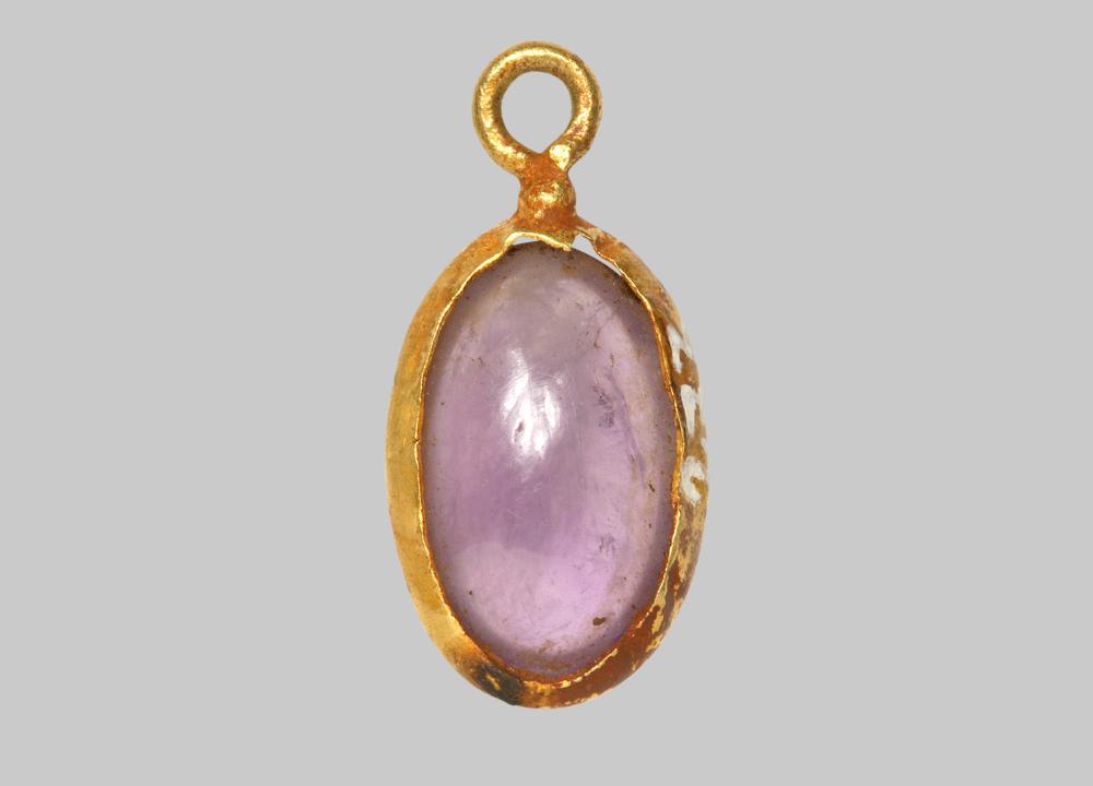 Ovaler gewölbter Amethyst, eingefasst von einem schmalen Goldblechstreifen. Fassung und Öse aus dünnem Draht sind durch Granulatkügelchen verbunden.