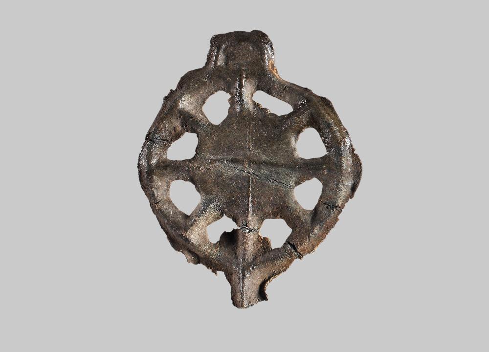 Votiv in Spiegelform; Mitte volle Scheibe mit kreuzförmiger Erhebung; Rand radförmig mit 8 Speichen, Zwischenräume durchbrochen; oben Öse (nicht durchbrochen), unten Griff.