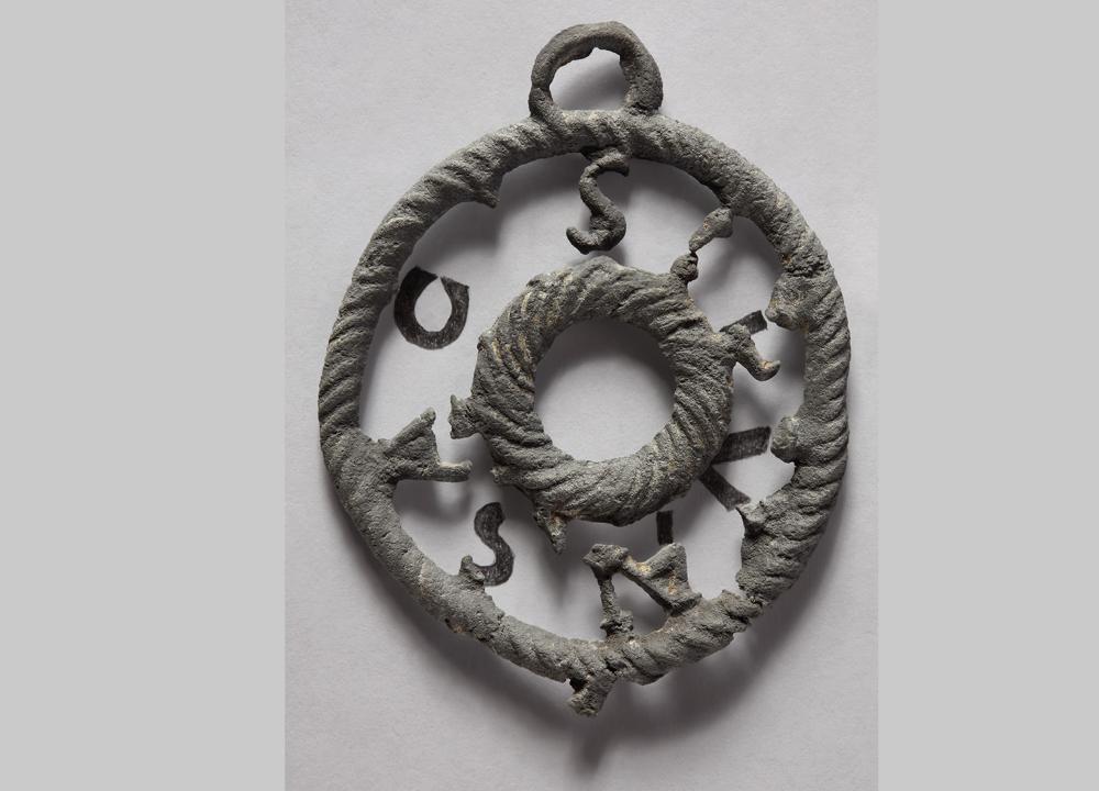 Bleivotiv in Spiegelform; Weihung für die Silvanae; innerhalb des Rahmens Buchstaben, Zwischenräume durchbrochen; Buchstaben teilweise in Ligatur; äußerer und innerer Ring mit Schrägschraffierung; oben Öse (durchbrochen), unten Ansatz eines Griffes erhalten.
