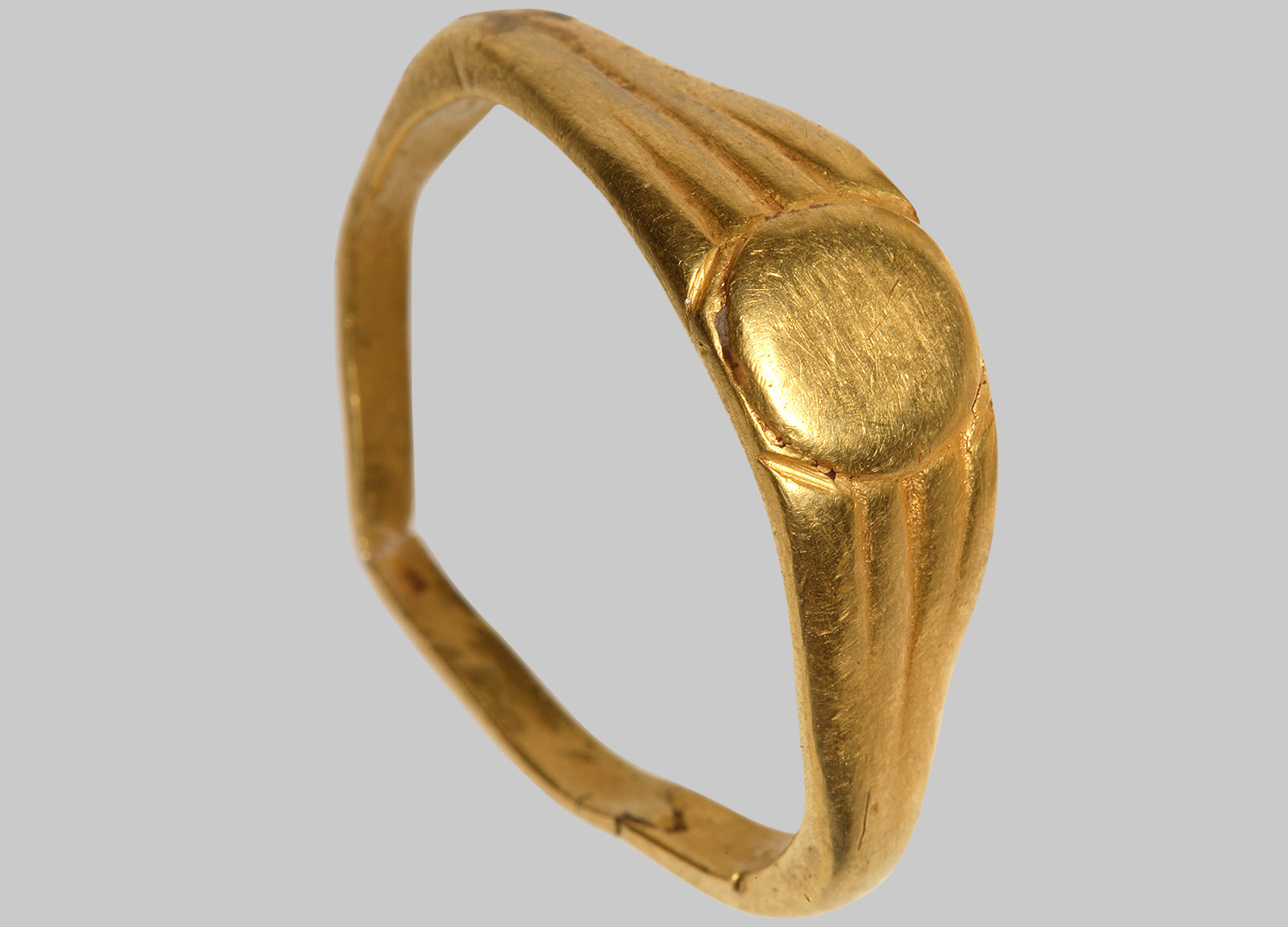 Im Querschnitt D-förmiger Reif, der sich zur Ringplatte hin verbreitert. Die scharf abfallenden Schultern mit seitlichen Einkerbungen sind schräg nach außen verformt und mit je drei V-förmigen Längskerben Richtung Platte verziert. Die runde glatte Ringplatte ist ohne Verzierung.