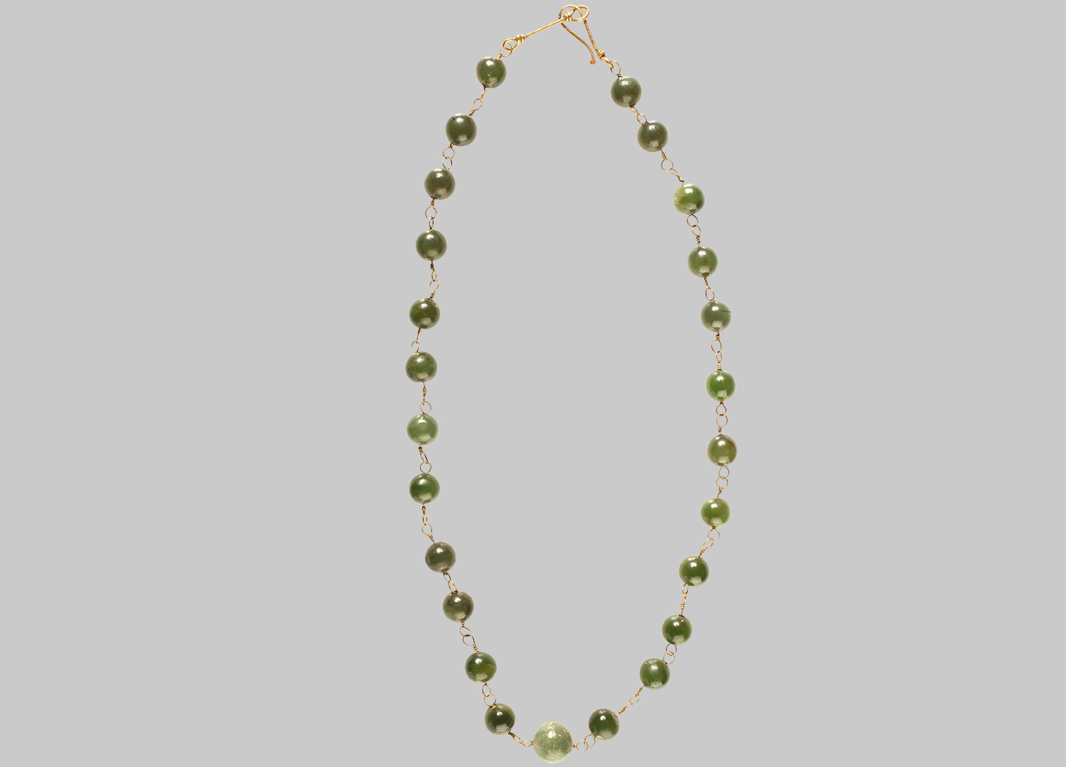 25 grüne runde Perlen (Dm 0,8–1,0 cm). Durch jede Perle führt ein Drahtglied aus Gold, dessen beide Enden zu Schlaufen gebogen sind. Haken-Ösenverschluss.