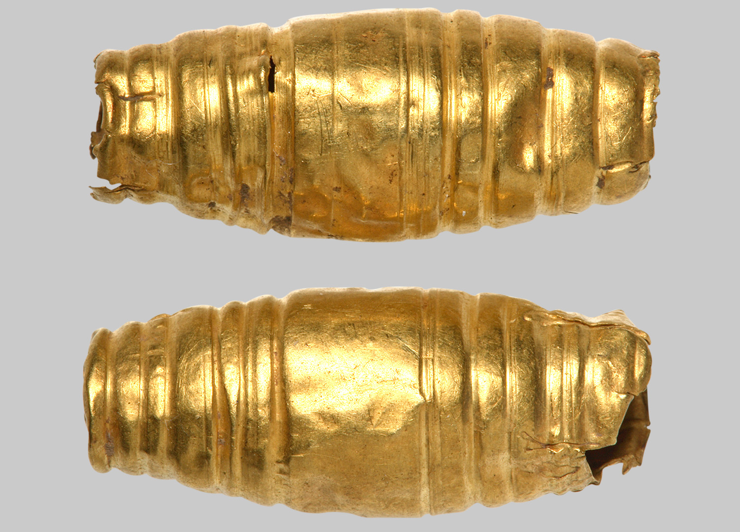 Zwei spindelförmige, geriefelte Goldblechperlen (Dm 0,7–0,8 cm). Jede Perle ist mit sechs Querrillen an jedem Ende verziert, die Mitte der Perle ist glatt.
