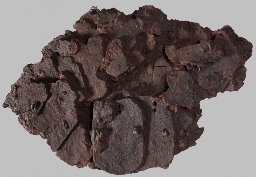 Mehrere miteinander verbundene, unbewegliche, unten abgerundete Schuppenfragmente mit bronzenem Draht.