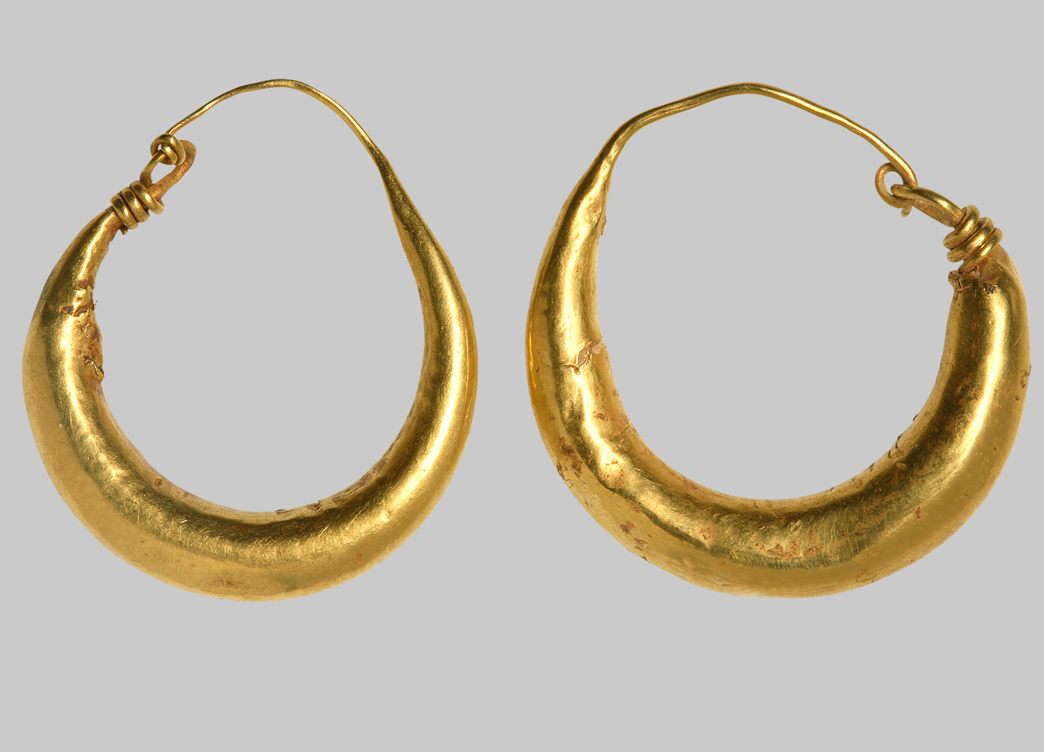 Lunulaförmige Ohrgehänge aus hohlem Goldblech (Dm max. 0,5 cm) mit Haken-Ösenverschluss, an beiden Enden ein Golddraht zum Einhängen. Die Haken sind um die Öse gewickelt.